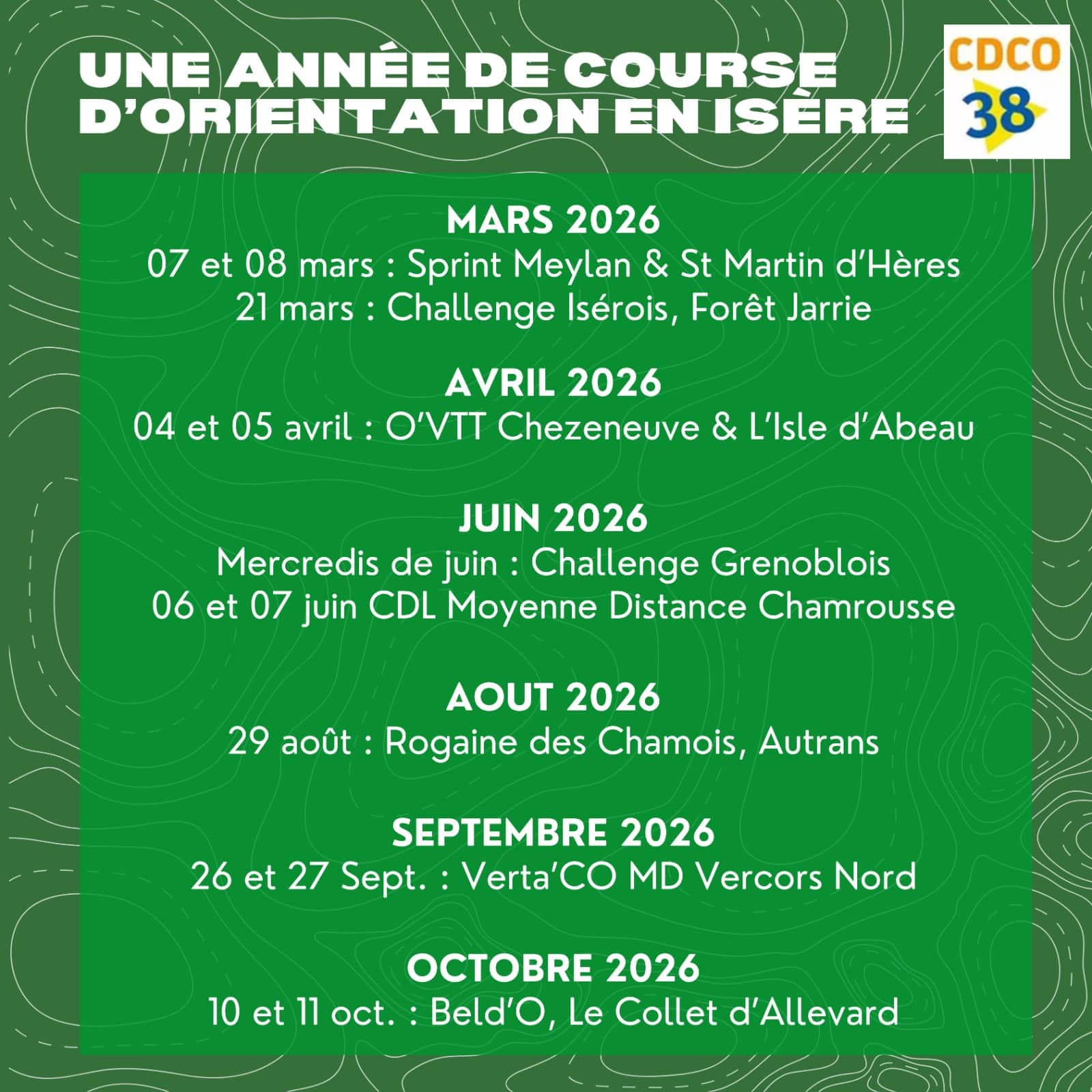 - Le samedi 21 mars 2026 : CO Forêt à Jarrie. Informations à venir : Site Internet du GUC CO